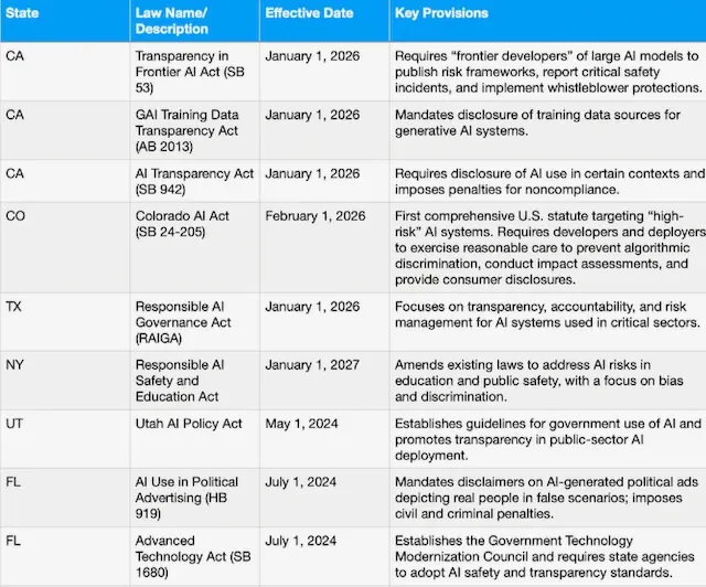 States have moved quickly to regulate AI, with over 1,000 AI-related bills introduced in 2025 alone, and several states have already enacted significant laws, effective in 2026: